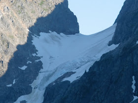 The high point on the hike/run was 7600 feet, and there was some pretty steep climbing on the arm. I saw one other runner, and he was taking things much more seriously than me, motoring. The campsites at the Sahale Glaicer are rings of stones--there's one in the pic below of me in the foreground, before the sea of mountains. I want to camp there now--the folks I talked to who camped there the night before, under a full moon, called it an experience of a lifetime.